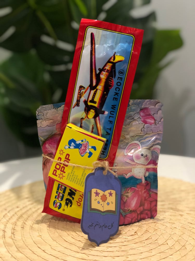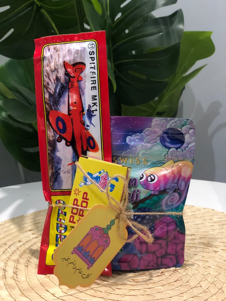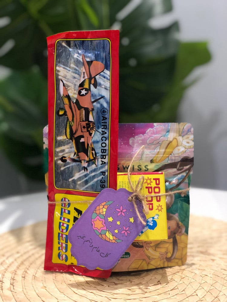 تحتوي على : 1 كيس حلاوة باتي سويس بالشوكولاتة او حلاوة جيلي من باتي سويس ( الاختيار عشوائي ) طيارة قديمة او عصفور ( لعبة الطيبين ) علبة طراطيع ثوم
